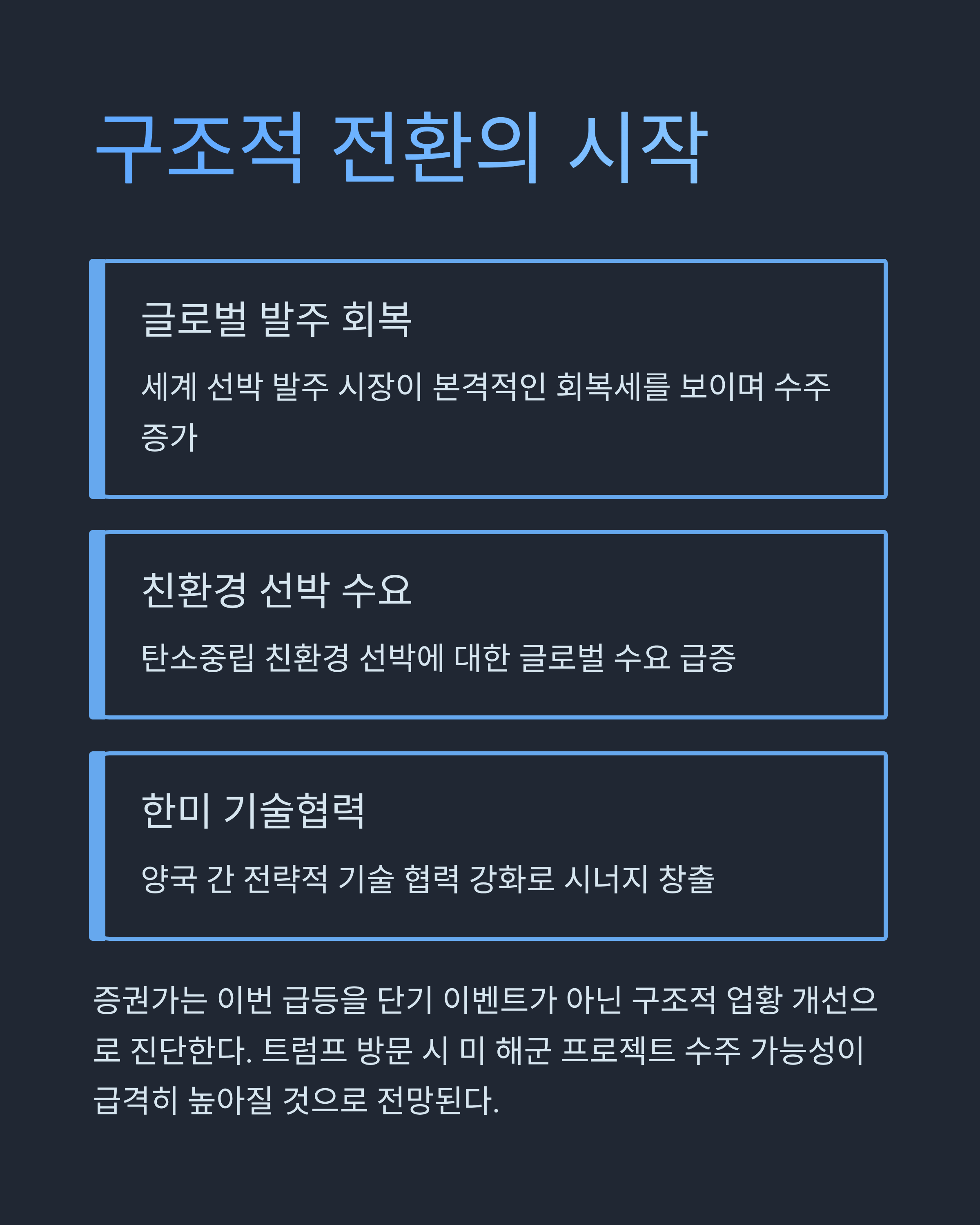 금융 전문가들은 이번 조선주 급등을 단순한 기대감 이상의 흐름으로 본다.