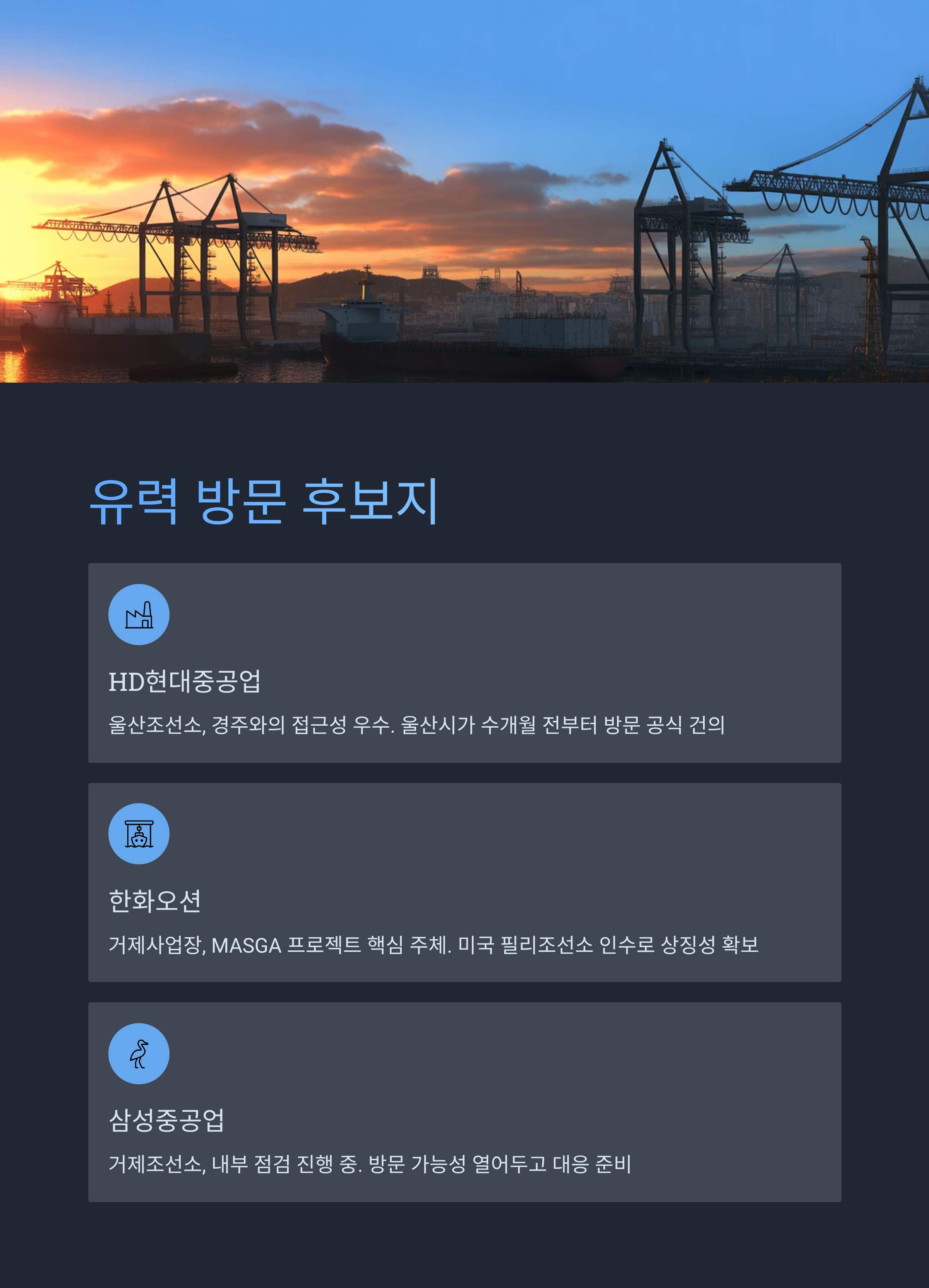 방문 후보로는 HD현대중공업 울산조선소, 한화오션 거제사업장, 삼성중공업 거제조선소가 거론되고 있다.