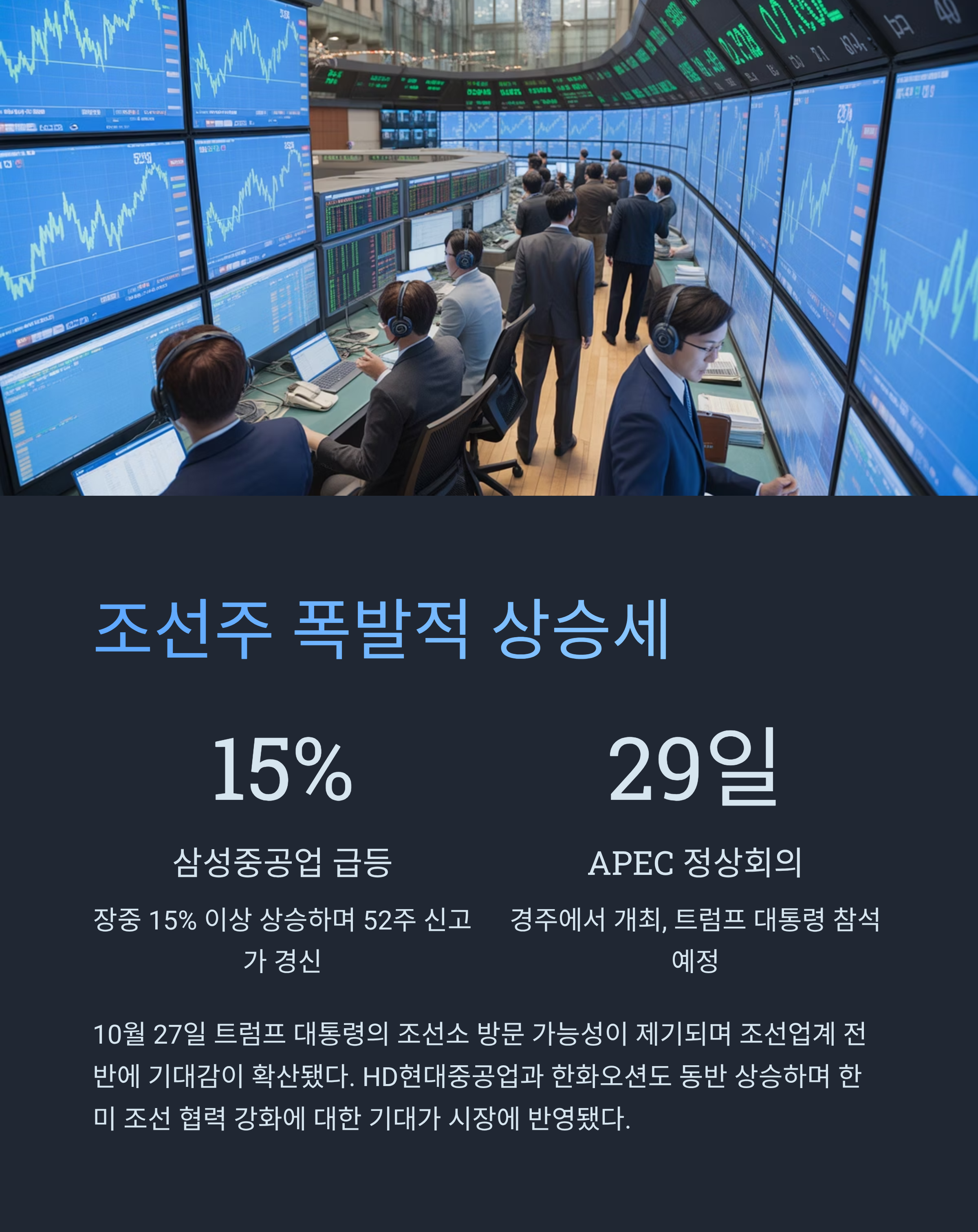 10월 27일 국내 증시에서는 조선주가 폭발적인 상승세를 기록했다. 도널드 트럼프 미국 대통령의 국내 조선소 방문 가능성이 제기되면서 업계 전반에 기대감이 번졌기 때문이다.