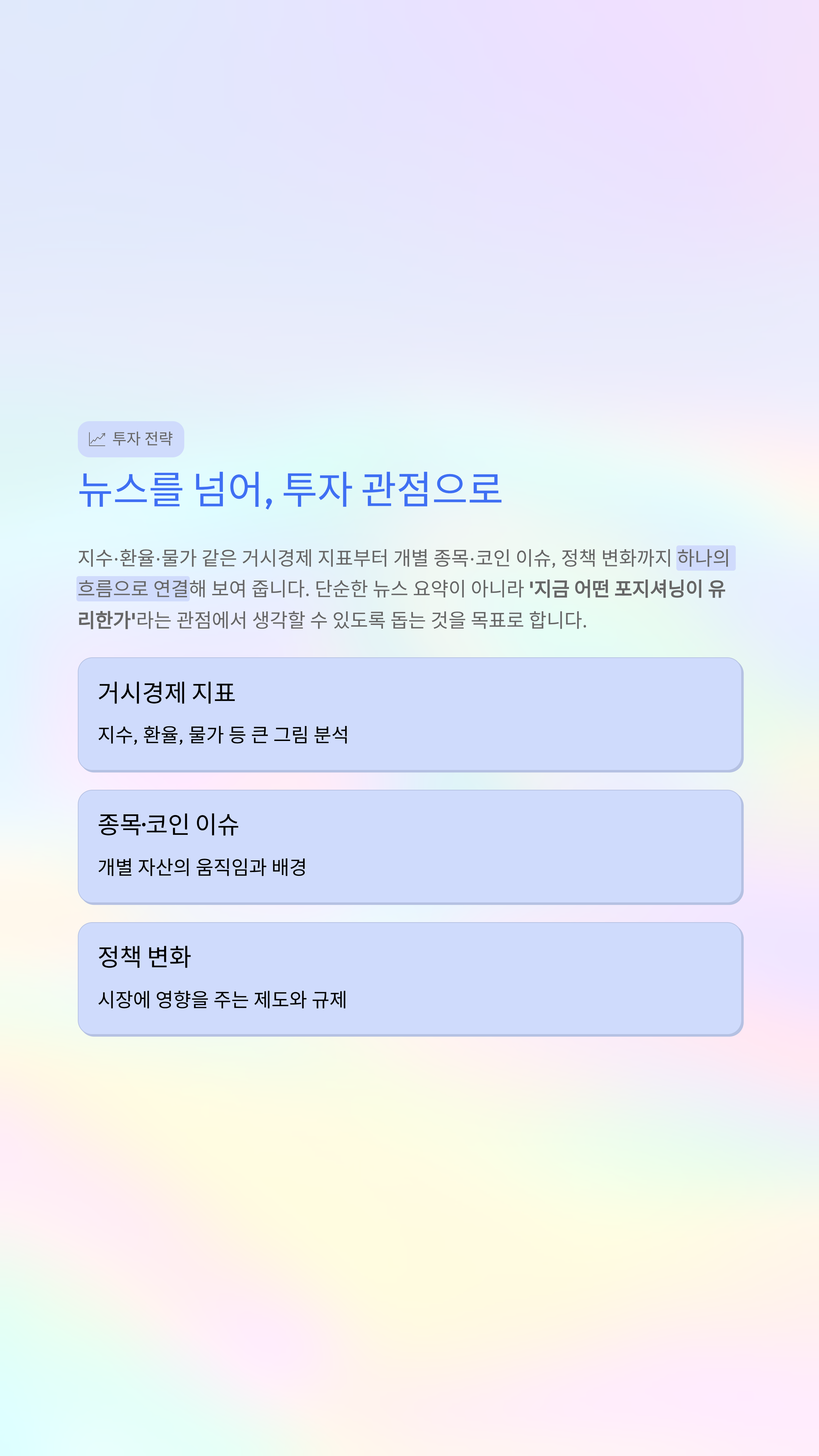 지수·환율·물가 같은 거시경제 지표부터 개별 종목·코인 이슈, 정책 변화까지 하나의 흐름으로 연결해 보여 주며, 단순한 뉴스 요약이 아니라 ‘지금 어떤 포지셔닝이 유리한가’라는 관점에서 생각할 수 있도록 돕는 것을 목표로 합니다.